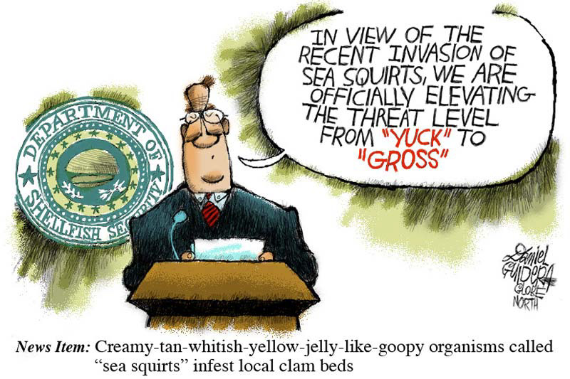 Newspaper cartoon for The Boston Globe's North suburban section on unpleasant stuff that comes from the sea.