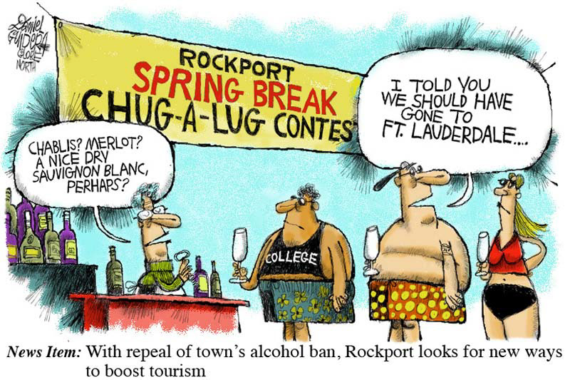 Newspaper cartoon for The Boston Globe's North suburban section on a tony town's attempt to become a fun destination.