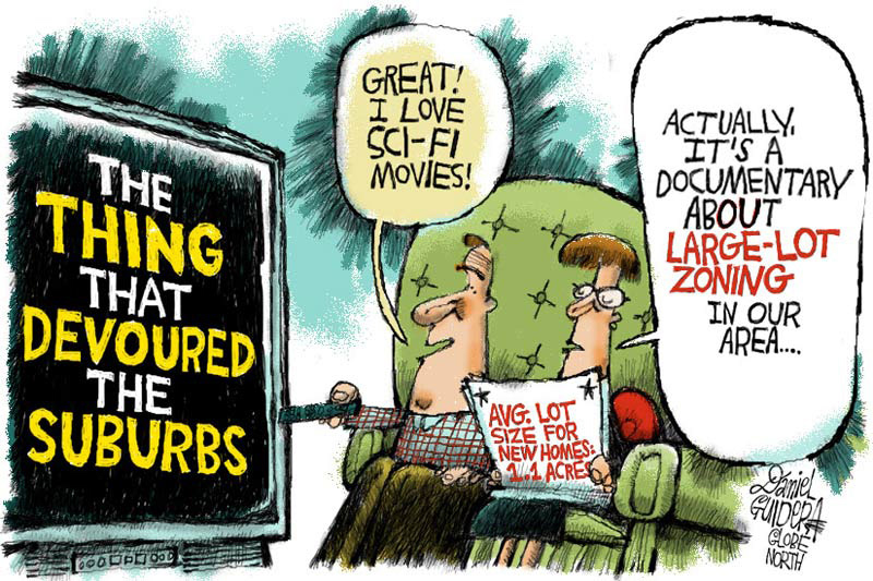 Newspaper cartoon for The Boston Globe's North suburban section on super-sized zoning regulations.
