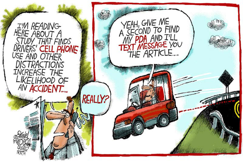 Newspaper cartoon for The Boston Globe's North suburban section on upping the ante on highway chaos.