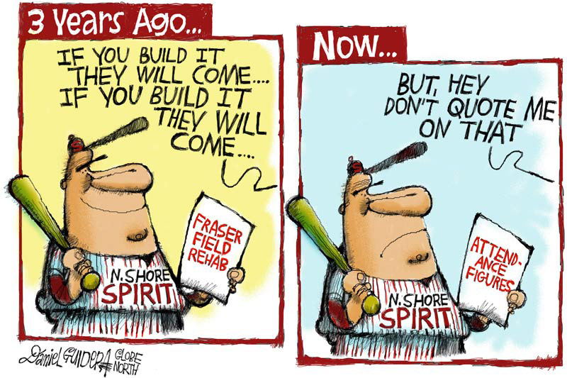 Newspaper cartoon for The Boston Globe's North suburban section on a local team's sagging attendance.