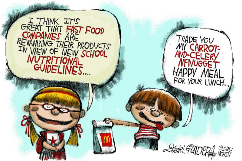 Newspaper cartoon for The Boston Globe's North suburban section on school lunch regulations.