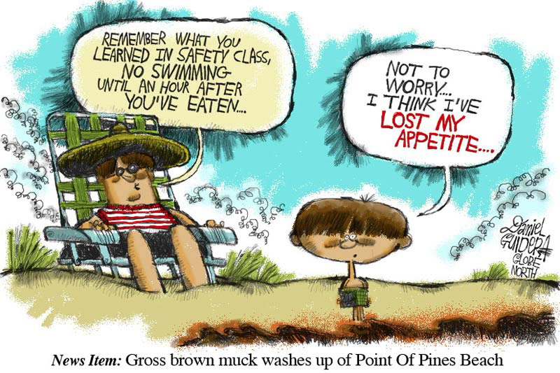 Newspaper cartoon for The Boston Globe's North suburban section on a beach that's no day at the beach.