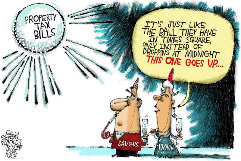 Newspaper cartoon for The Boston Globe's North suburban section on communities ringing in the New Year with Sticker Shock.