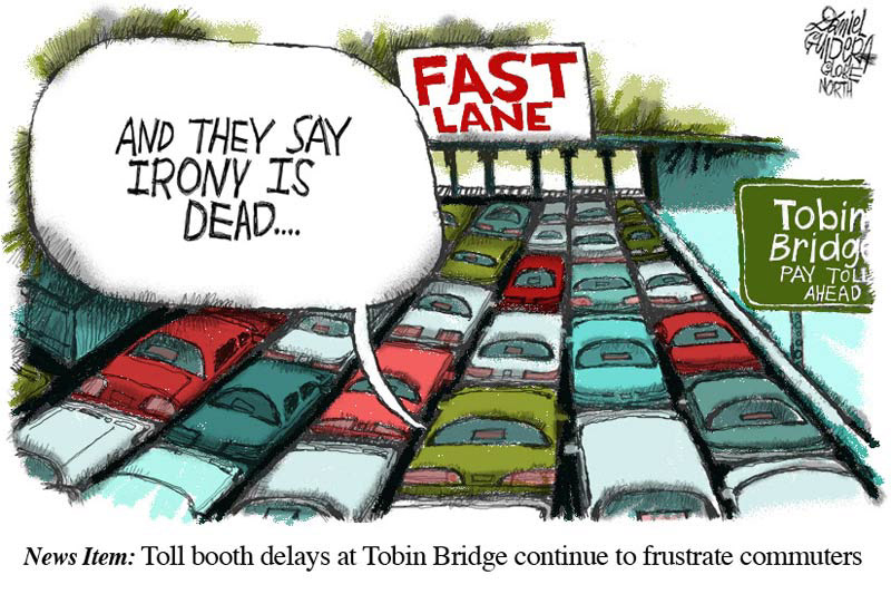 Newspaper cartoon for The Boston Globe's North suburban section on a not-so-fast tollbooth bottleneck.