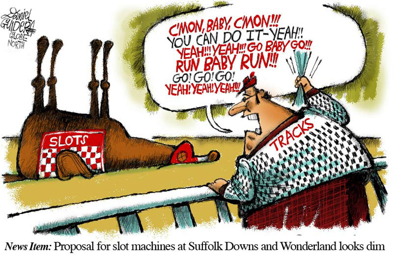 Newspaper cartoon for The Boston Globe's North suburban section on rebooting region's gambling options.