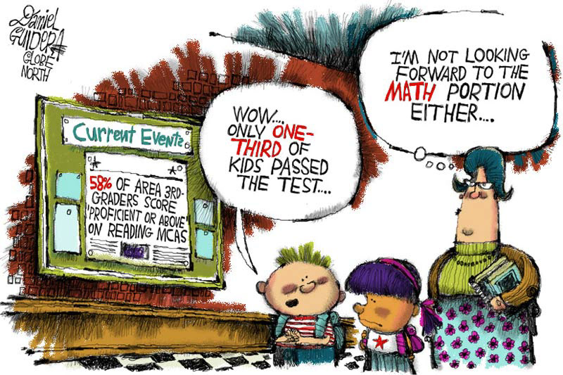 Newspaper cartoon for The Boston Globe's North suburban section on crunching the numbers.